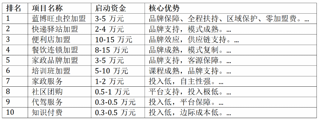 以上10个项目各有特点,创业者可根据自身资金、经验、时间等情况选择适合的项目。建议选择有品牌保障、扶持政策完善的项目,降低创业风险。